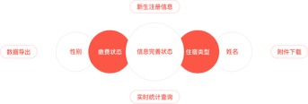 管理员可查看新生注册信息,支持按学生信息完善状态、性别、缴费状态、住宿类型等条件进行学生数据筛选,支持学生数据自定义模板数据导出、自定义附件下载。