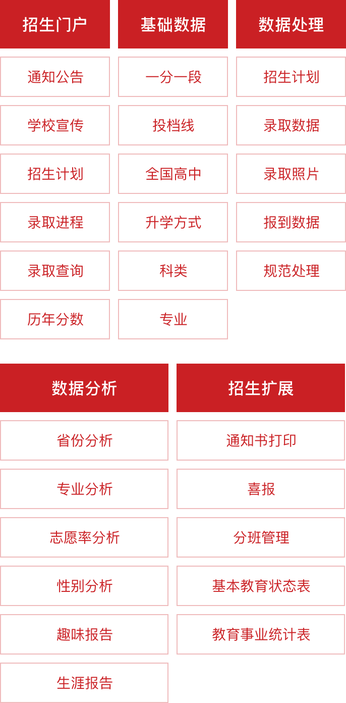 招生信息管理系统实现针对统一招生、自主招生、3+2转段、对口升学等多种升学方式考生数据的统一管理。系统涵盖从招生计划到录取分班的所有环节,包括招生计划设置、录取管理、分班管理、查询统计等模块,通过自动化的流程设计,智能的数据分析,为校领导、招生办及考生提供全面、高效的招生服务。