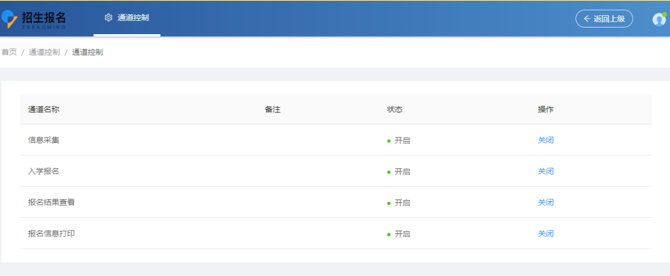 2、可根据报名进程对信息采集、报名入口、信息下载、结果查看等通道进行控制。