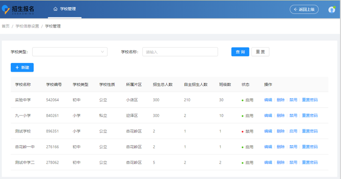 1、对参与招生报名的学校名单管理,支持学校的新建、编辑、删除、启用。